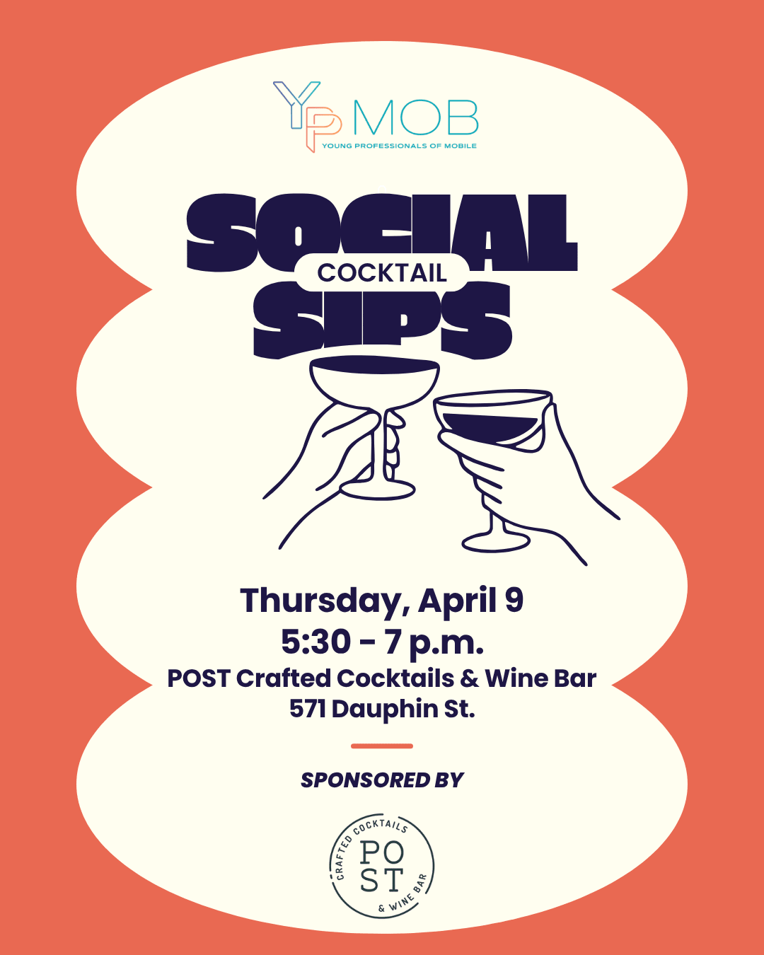 We hope you can join us for our Young Professionals of Mobile Social Sips on April 9 at 5:30 p.m. at POST Crafted Cocktails & Wine Bar.