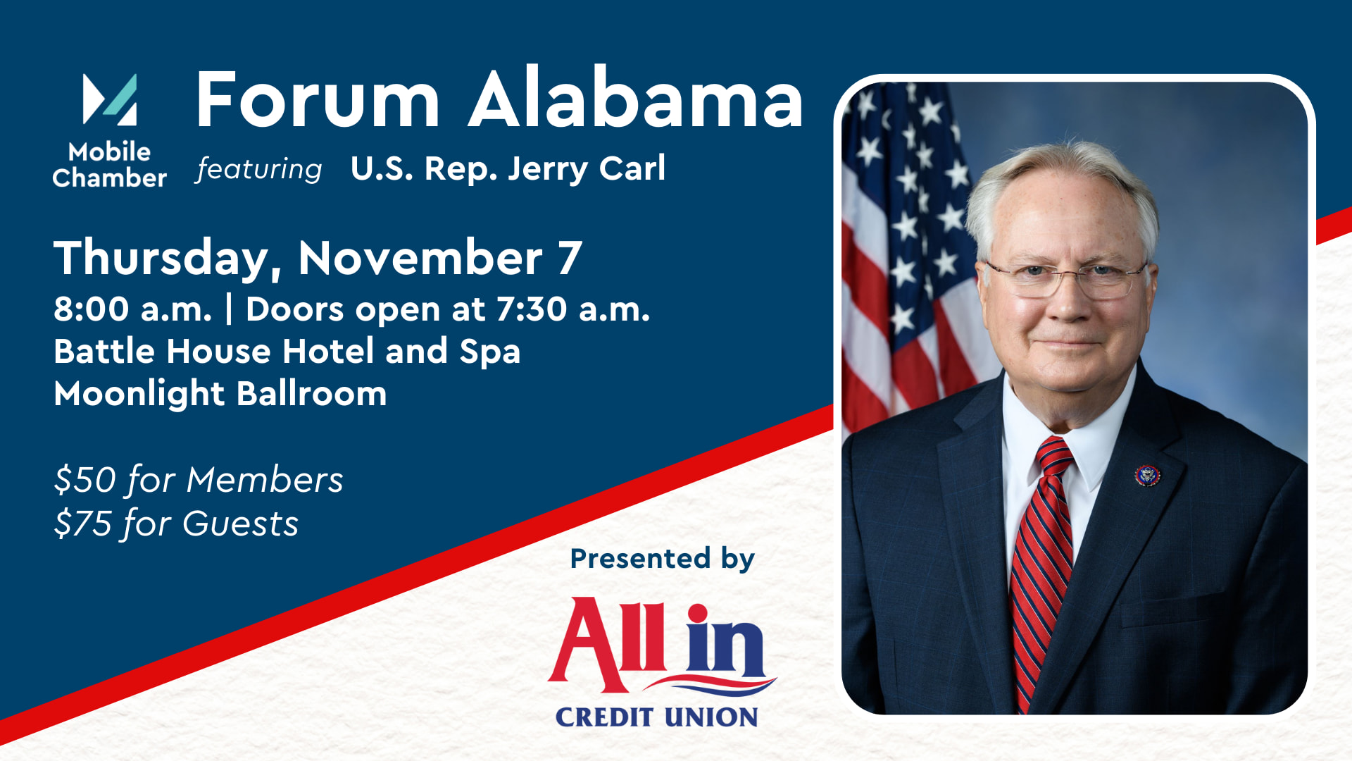 The Mobile Chamber’s Forum Alabama series provides a platform for Mobile’s business community to hear directly from members of Alabama’s congressional delegation and statewide elected officials on policy and business issues directly affecting our region.